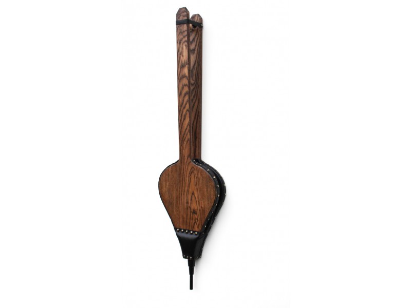Our traditional wood long handled bellows are made from kiln-dried ash and finished with a medium depth walnut stain. The leather is available in black, brown, burgundy, dark blue or dark green. Brown is probably the most traditional but the other colours also look very smart with the wood. The dark studs compliment the matt black steel nozzle. There is a hole in the back of the handle for hanging and a retaining strap keeps the bellows ship-shape when not in use.